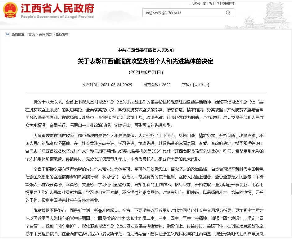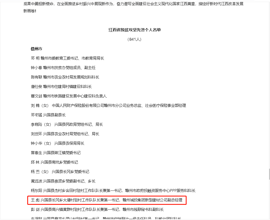 6月23日,省委、省政府召開全省脫貧攻堅總結表彰大會,表彰一批在打贏脫貧攻堅戰(zhàn)中作出突出貢獻的個人和集體,其中,興國縣長岡鄉(xiāng)大塘村駐村工作隊隊長兼第一書記,贛州城投集團新型建材公司副總經(jīng)理王彪獲“江西省脫貧攻堅先進個人”榮譽稱號。