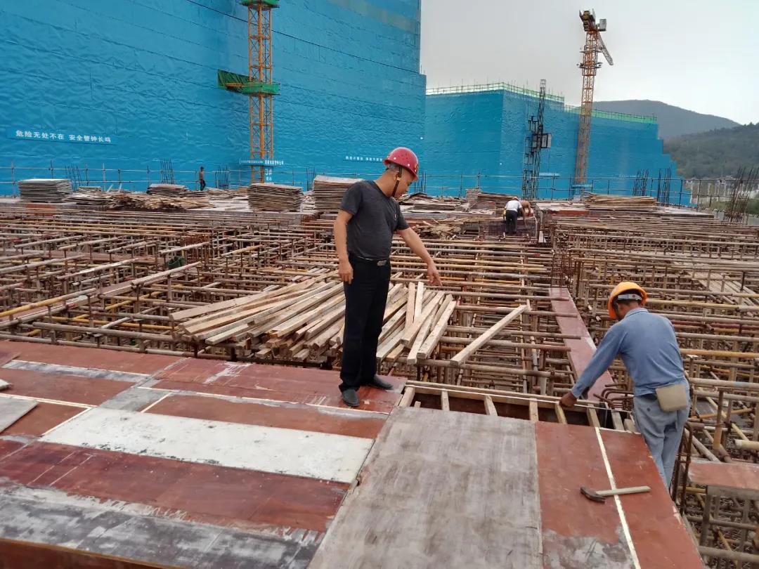 在中國(guó)科學(xué)院贛江創(chuàng)新研究院一期新建項(xiàng)目,工程管理公司項(xiàng)目經(jīng)理在項(xiàng)目施工現(xiàn)場(chǎng)指導(dǎo)木工作業(yè)。