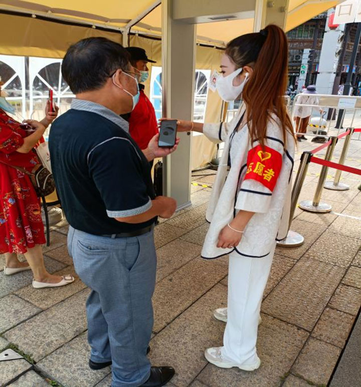 土地置業(yè)公司的志愿者在江南宋城歷史文化旅游區(qū)值班值守,引導(dǎo)廣大游客疫情期間掃碼入場(chǎng),積極佩戴口罩,做好安全旅游防護(hù)措施。