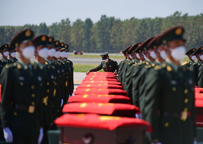 △2021年9月2日,在沈陽(yáng)桃仙國(guó)際機(jī)場(chǎng),禮兵在殮放志愿軍烈士遺骸的棺槨上覆蓋國(guó)旗。當(dāng)日,第八批在韓中國(guó)人民志愿軍烈士遺骸由我空軍專(zhuān)機(jī)護(hù)送從韓國(guó)接回遼寧沈陽(yáng),109位志愿軍烈士英靈及1226件相關(guān)遺物回到祖國(guó)懷抱。新華社記者 楊青 攝